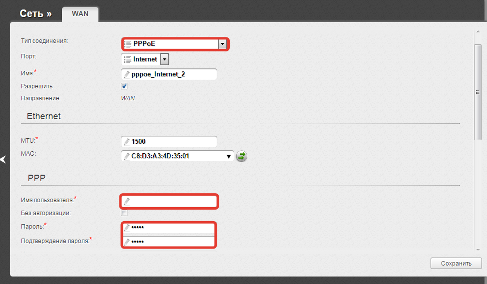 • Выберите «WAN» в разделе «Сеть». Если в списке уже есть одно соединение, не удаляйте его – оно будет автоматически деактивировано. Удаление же соединения может привести к возникновению ошибок.
