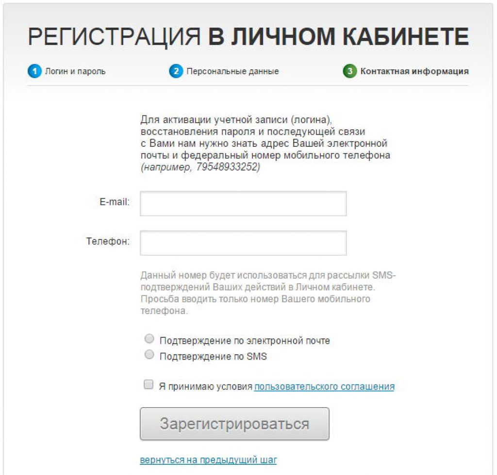8. Чтобы зарегистрироваться в личном кабинете Ростелекома, нужно заполнить и третье окно, в котором физическое лицо указывает свои контактные данные лица, а также активирует аккаунт через его привязку к номеру сотового. Здесь указывается только два параметра, необходимые для того, чтобы после регистрации в личном кабинете Ростелекома можно было восстановить пароль, если вдруг он вылетит из памяти и подтвердить свою волю относительно перечисления денежных средств на тот или иной счет.