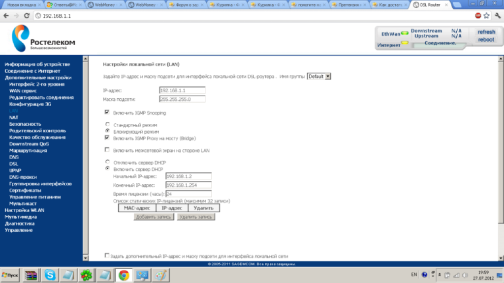 Стандартный ADSL-роутер с поддержкой Wi-Fi, который можно приобрести в салонах Ростелеком. В его настройках нет ничего неординарного: