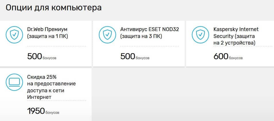 Тем, кто пока не понимает, как потратить бонусы Ростелеком, и изучает доступные варианты, следует знать, что наименьшее число предложений связано с услугами для компьютеров. В данном случае пользователи способны выбрать: