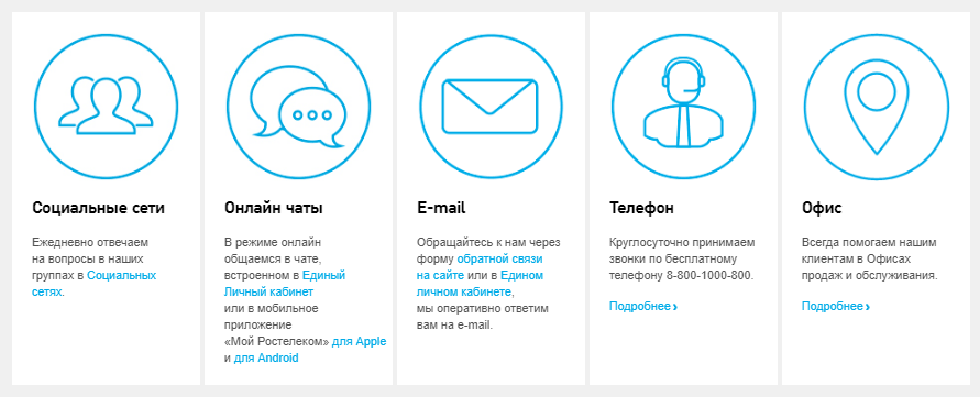 Для обеспечения удобства и скорости решения вопросов и обращений пользователей Ростелеком предоставил несколько возможностей оперативной связи со специалистами клиентской поддержки компании.