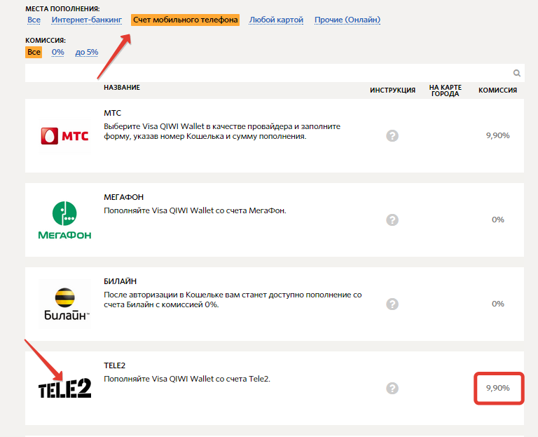 - Укажите местом пополнения мобильный телефон и выберите оператора «Tele2». Обратите внимание на комиссию: она составляет почти 10%.