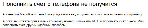 Сервис Яндекс позволяет пополнять кошелек, отправляя деньги с лицевого счета абонента сотовой связи, но, к сожалению, клиенты компании Tele2 этой функцией пока воспользоваться не могут.